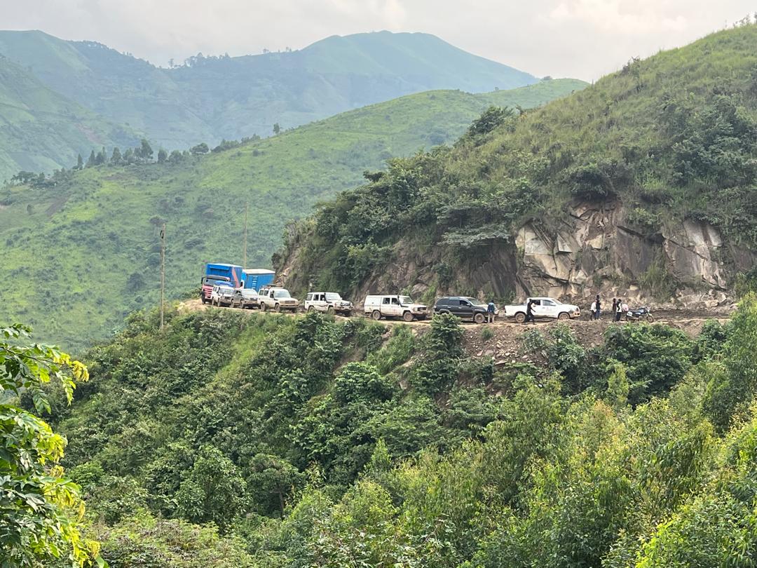 Blick auf die Nationalstraße 5 (Bukavu-Uvira, die durch Ngomo führt) Die Wiederaufforstung in Ngomo schützt die Artenvielfalt in der Region und verbessert das Wohlbefinden der Bevölkerung. Das Photo ist vom Februar 2025.